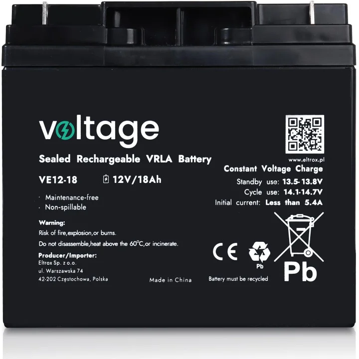 Akumulator Voltage VE12-18 został wykonany w technologii AGM (Absorbed Glass Mat), w której elektrolit wchłonięty jest w maty z włókna szklanego. Konstrukcja VRLA z samouszczelniającymi zaworami ciśnieniowymi eliminuje ryzyko wycieku oraz umożliwia bezpieczną pracę w dowolnej pozycji.